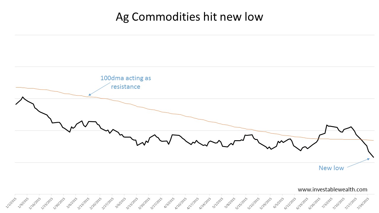 Ag commodities did break above their 100dma; however, they could not overcome the next level of resistance. The index has consequently confirmed its downward trend by hitting a new low. Thus, illustrating the harsh reality of a commodity market that seems bottomless.