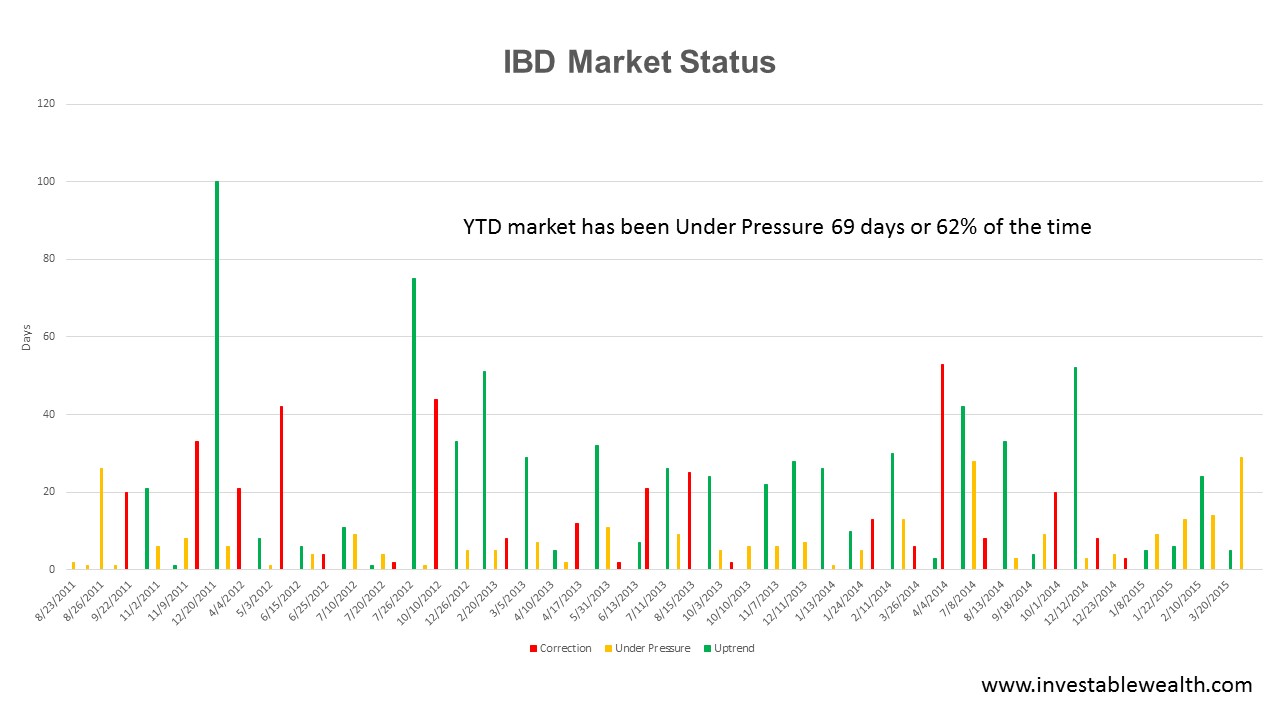 There has also been a decided change in the market’s “personality”. The below chart shows the duration of Investor’s Business Daily market status dating back to mid-2011. Market status doesn’t directly indicate the direction of the market, it’s a measurement of technical sentiment. Gone are the days when “uptrend” indicators lasted for extended periods of time (the high green bars). Year-to-date the market has been in “uptrend under pressure” status 62% of the time.